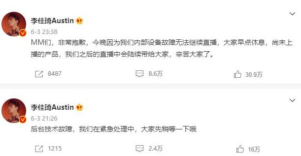 李佳琦直播還沒結(jié)束的時候,直播突然中斷了。直播被中斷之后,李佳琦就發(fā)布了一條微博信息因后臺技術(shù)故障,直播暫停。兩個小時后,李佳琦又發(fā)布了一條微博信息稱因內(nèi)部設(shè)備故障不能繼續(xù)開播,尚未上播的產(chǎn)品會在后面的直播中陸續(xù)上播。然而,直到618前夕,李佳琦也未曾恢復(fù)直播。